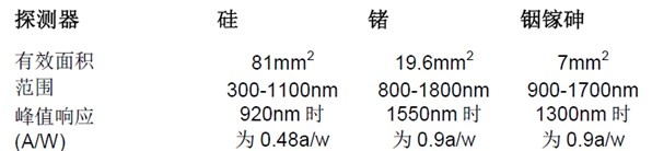 例如美國藍(lán)菲光學(xué)公司(Labsphere)的一款激光功率計(jì)(LFPMS)采用了硅型二極管探測器。 它的波長響應(yīng)范圍在300-1100nm處,其中峰值響應(yīng)在920nm時(shí)到達(dá)0.48A/W。下圖2是LFMPS光電二極管探測器的性能參數(shù)。