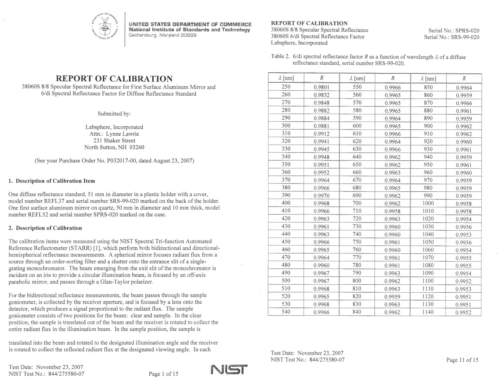圖1、NIST出具的Labsphere積分球涂層反射率校準(zhǔn)報告