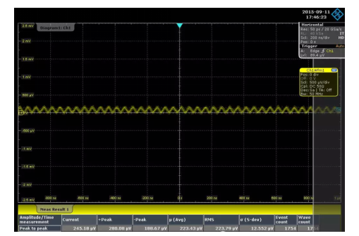 圖三:R&S示波器在垂直方向靈敏度達(dá) 1 mV/div 的全帶寬測(cè)量