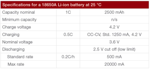 做為恒流測(cè)試示例,我們使用鋰離子18650電池。以毫安為單位的容量(C)用于計(jì)算充電和放電電流。充電時(shí),電流限制為0.5C(在我們的示例中為1250mA),需要在電池電壓達(dá)到4.2V之前停止充電。參見(jiàn)表1。
