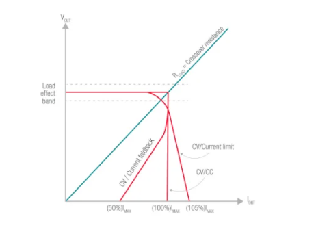 此下降稱為交叉區(qū)域。伴隨著負(fù)載電阻的進(jìn)一步降低,電源的限流電路現(xiàn)在處于活動(dòng)狀態(tài)。高質(zhì)量電源將向這個(gè)恒定電流區(qū)域急劇過(guò)渡。