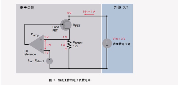 電流放大器將分流器上的壓降與參考編程值進(jìn)行比較(例如1A*1Ω=1V)。放大器輸出信號(hào)調(diào)節(jié)FET電阻和電子負(fù)載的輸入電流。這類(lèi)反饋配置允許負(fù)載動(dòng)態(tài)地改變電阻并保持編程電流,而不受電源設(shè)備電壓變化的影響。負(fù)載可以吸收所需電流的最小電壓受輸入電流水平和FET的低電壓行為特性的限制。