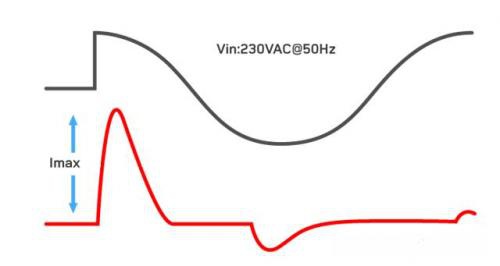在上電階段燈具內(nèi)的LED電源可被看做一個(gè)容性器件,浪涌電流產(chǎn)生的原因很多,比較常見的就是室外雷擊,或者是大的負(fù)載開啟,關(guān)斷。如圖所示顯示了典型的浪涌電流在帶有容性負(fù)載230Vac50HzAC線路輸入的變化情況。