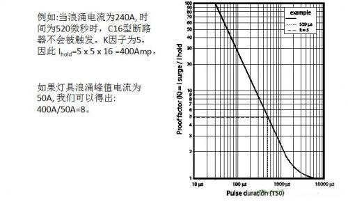 如果同時(shí)連接多個(gè)LED燈具,則最大浪涌電流及其持續(xù)時(shí)間可能會觸發(fā)微型斷路器或俗稱空開的保護(hù),針對工業(yè)感性電器或負(fù)載應(yīng)用一般建議是使用C型或D型斷路器,其能承受的浪涌數(shù)值更大,如下所示是一個(gè)典型的斷路器跳閘曲線,顯示了觸發(fā)一個(gè)斷路器保護(hù)所需的電流數(shù)值及持續(xù)時(shí)長。