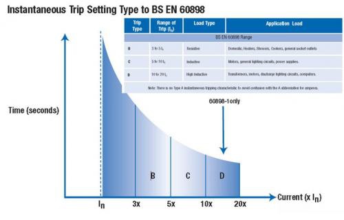 這些曲線因制造商和類型而有所不同。按照其最常用的ABBS201M系列的數(shù)據(jù)表,一般來說,B型斷路器曲線的工作范圍為3至5In,C型為5至10In,D型為10-14In。