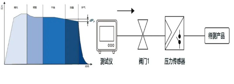 泄漏的氣體是不能直接被測量的,而是通過外泄氣體所產(chǎn)生的效應(yīng)入手,也就是說當(dāng)把工件和壓縮空氣氣源切斷后,如果氣體外泄則工件內(nèi)部的壓力必然要發(fā)生變化,我們要測量的便是這個壓力變化,通過計算工件內(nèi)部壓力變化,來完成生產(chǎn)線上的被測產(chǎn)品的良莠判定。原理如下圖示:
