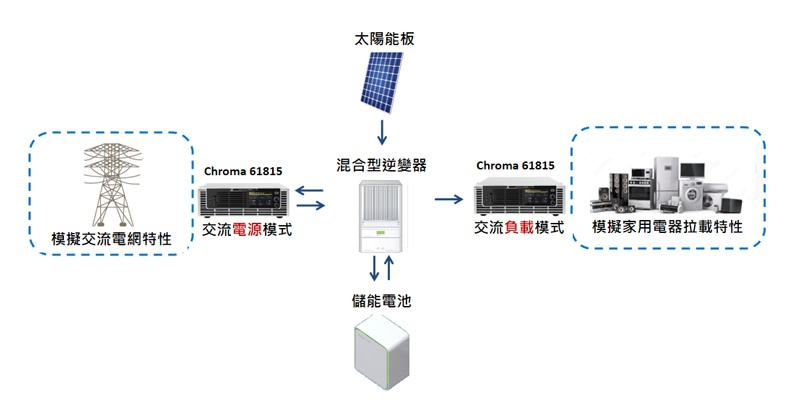 ▲Chroma 61815一機實現(xiàn)混合型逆變器的交流電源和交流負載測試需求