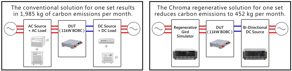 致茂電子持續(xù)推出新能源回收測試解決方案,運用新的電網(wǎng)模擬器61800及雙向直流電源62000D兩臺設(shè)備可達傳統(tǒng)四臺設(shè)備之功能,在測試過程中將待測物輸出能量回饋到電網(wǎng)直接循環(huán)利用,降低設(shè)備成本、節(jié)省設(shè)備體積、更重要的是達到節(jié)能減碳目的,以下案例為11kW雙向車載充電器測試碳排放比較,使用Chroma能源回收式方案每月可減少1,533公斤碳排放,2022年,致茂已協(xié)助國際電動車廠家及ODM廠商導(dǎo)入此方案并減少碳排放3,496公噸(等同為地球種了249,660顆杉樹)。