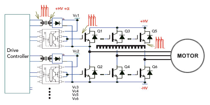 另外,每個(gè)IGBT模塊的閘極(Gate)與射極(Emitter)之間?作偏壓可能是由各別的變壓器所提供,而變壓器的??次側(cè)之間也會(huì)存在?頻的?電壓差(如圖?)。當(dāng)變壓器一二次側(cè)的絕緣能?不足,異常放電所產(chǎn)生的電壓/電流可能會(huì)導(dǎo)致IGBT毀損,且?壓放電的突波也可能會(huì)使數(shù)位控制動(dòng)作異常。