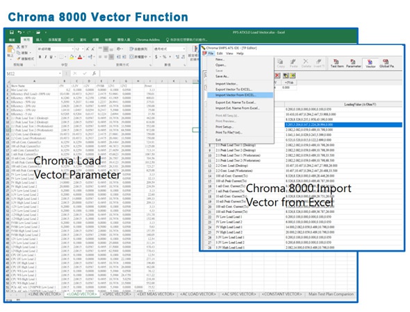 ATX3.0規(guī)范PSU各輸出信道負(fù)載測試條件設(shè)置均需參考文件編號(hào)338448 Desktop Platforms Power Supply Test Plan,超過60余項(xiàng)相當(dāng)復(fù)雜的負(fù)載條件需要設(shè)置,故Intel另發(fā)布Test Plan Companion Calculator Excel文檔,方便PSU廠商運(yùn)用計(jì)算測試負(fù)載條件。但要將如此多的負(fù)載條件一一輸入自動(dòng)化測試系統(tǒng)填入對(duì)應(yīng)的測試項(xiàng)目進(jìn)行測試,工作仍十分繁瑣費(fèi)時(shí);致茂電子8000系統(tǒng)廣泛應(yīng)用于電源產(chǎn)品的自動(dòng)化測試,其具備負(fù)載向量(Vector)參數(shù)設(shè)定功能,可利用Excel編輯測試參數(shù)再匯入8000測試程序中,故致茂電子將Intel的Test Plan Companion Calculator內(nèi)容解譯并入Vector Excel格式檔,使用者只需輸入PSU功率與各輸出信道電流規(guī)格后,相關(guān)測試項(xiàng)目的負(fù)載條件便可自動(dòng)計(jì)算帶入,再將其匯入8000系統(tǒng),如此一來測試程序(Test Program)里所有測項(xiàng)的負(fù)載測試條件便自動(dòng)更新設(shè)定,可大幅縮短至少90%以上的測試參數(shù)修改時(shí)間,加快PSU的測試驗(yàn)證。