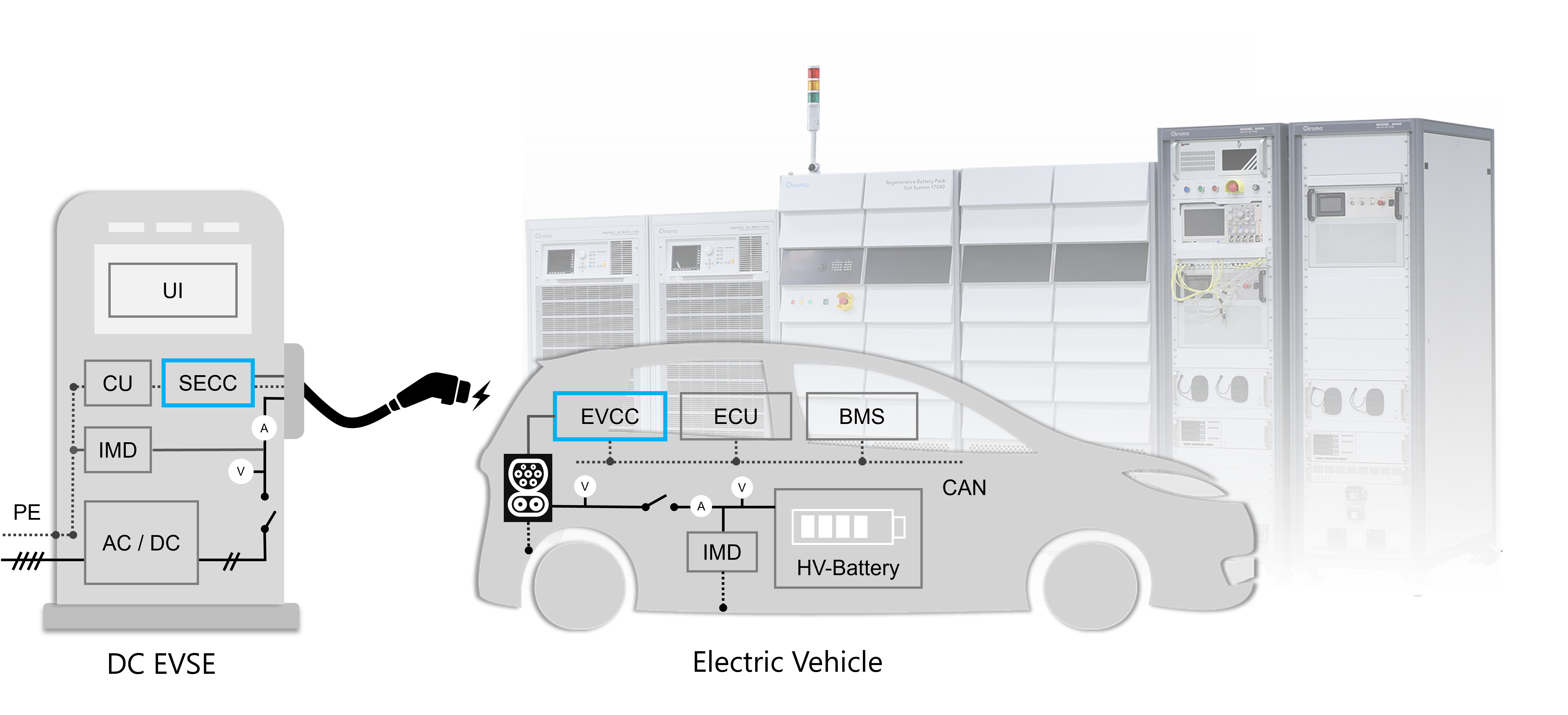 當(dāng)充電槍插上電動車的充電座之后,雙邊的接觸偵測與通訊協(xié)議就開始運(yùn)作。當(dāng)在充電預(yù)備、開始和結(jié)束的各狀態(tài)中,若充電設(shè)備通訊控制器(SECC)和電動車通訊控制器(EVCC)交握有任何異常(包含超時、資料格式辨識、異常處理、時序等),充電運(yùn)行就將會被迫中斷。所以自動化測試系統(tǒng)(ATS)必須具備模擬電動車通訊的功能,甚至可以故意設(shè)定異常動作,以驗(yàn)證充電樁的中斷保護(hù)功能。另外ATS還需模擬電動車的充電座,規(guī)格必須能符合電氣測試之要求,且具備電子鎖、溫度監(jiān)控、大功率斷路器以及散熱功能,可確保測試過程的安全性。測試系統(tǒng)建議采用模組化且可更換的EV模擬器與充電座,可快速更換避免產(chǎn)線因異常問題造成長時間測試中斷。另外好處是可彈性調(diào)整測試不同標(biāo)準(zhǔn)的產(chǎn)品,或未來需求而升級。