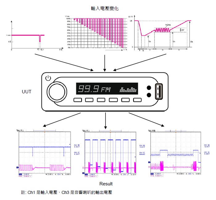 ▲Chroma 62000P進行ISO 16750-2標準對車用音響進行測試案例