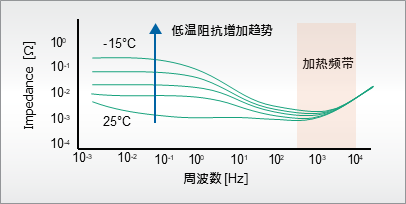 由于電解質(zhì)在零下溫度離子導(dǎo)電度降低,使鋰離子電池芯內(nèi)阻上升而降低正常的能量及功率輸出/入能力,交流加熱技術(shù)運(yùn)用適當(dāng)頻率的交流電流通過(guò)內(nèi)阻使其產(chǎn)生熱量,功率主要由電阻成分及交流電流有效值決定。影響電解液加熱效率的是使用的交流訊號(hào)振幅與頻率,相關(guān)研究指出高頻(~1kHz)訊號(hào)能產(chǎn)生更好的加熱效率且避免衍生電池劣化。