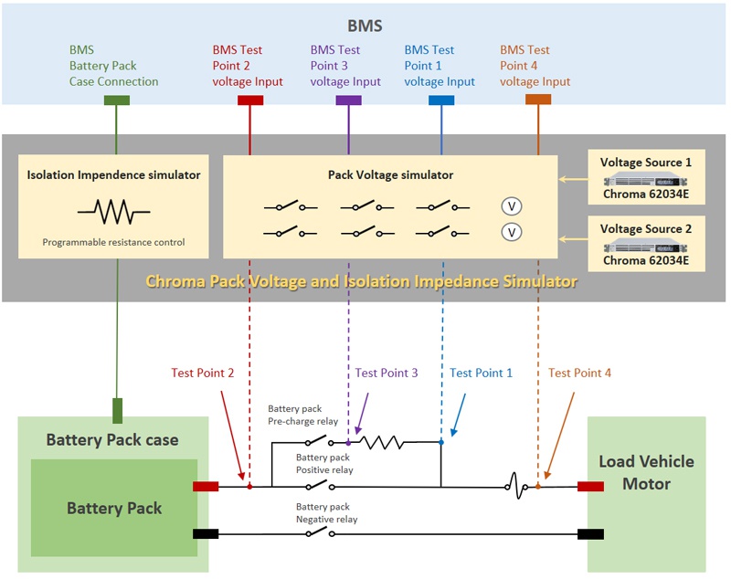 另外一個要注意的情況是,在實車中,電池包外殼(Battery Pack Case)是與車身相連,由于輸往馬達的電壓與電流極大,整個輸電線路都必須確保與電池包外殼有著一定的阻抗值以避免感電。一旦電池包外殼感電,整個車身、車門外殼等都會帶電,這會造成人員感電危害,非常危險。因此驗證BMS能確實偵測每個點位阻抗過低的情況,并做出相對應(yīng)的保護動作十分重要。然而,每個點位所能允許的最低阻抗值又會依據(jù)產(chǎn)品的設(shè)計而有所不同,因此測試此一工況時,必須要針對各個點位調(diào)整適當(dāng)?shù)淖杩蛊ヅ湟赃_成最佳的測試驗證效果。