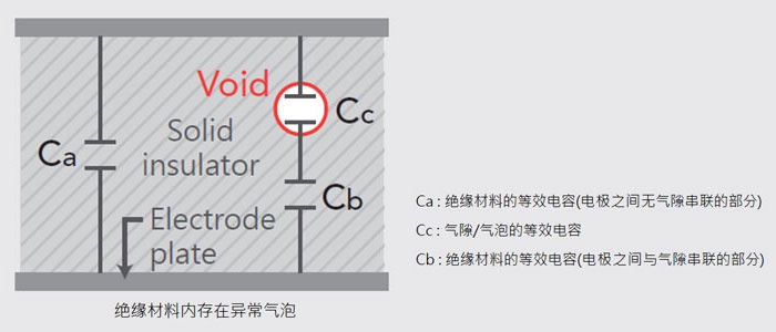 當絕緣體內(nèi)存在氣泡(Void)或絕緣體間存在氣隙(Air gap)時,在正常工作電壓下氣泡或氣隙容易發(fā)生局部放電(Partial Discharge,PD),導(dǎo)致絕緣劣化造成絕緣質(zhì)量異常,例如:樹酯內(nèi)有氣泡或漆包線間的氣隙,因為空氣的介電系數(shù)較低,氣泡或氣隙的電容量比原絕緣材料低,所以會分到相對高比例的電壓,且在相同間隙距離條件下,氣泡或氣隙的崩潰電壓比絕緣材料的低。此類放電發(fā)生于氣泡或氣隙等局部瑕疵, 但與其串行之絕緣材仍維持正常的放電現(xiàn)象稱之為局部放電。