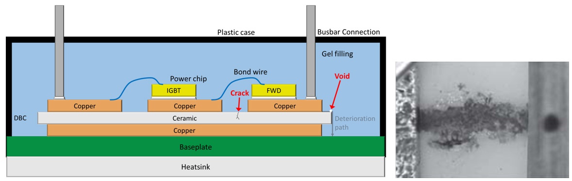 功率組件中的IGBT與SiC-MOSFET被應(yīng)用于各種領(lǐng)域(譬如:電子產(chǎn)品、工業(yè)設(shè)備、航空航天、軍用設(shè)備、鐵路設(shè)備、新能源、智慧電網(wǎng)、新能源車等),且經(jīng)常被使用于高功率/大電流的電源轉(zhuǎn)換/控制線路,工作電壓通常都是數(shù)千伏特,由于會被切換ON/OFF狀態(tài)的關(guān)系,模塊中的閘極(Gate)與集極(Collector)或汲極(Drain)之間,以及模塊與散熱板之間會出現(xiàn)PWM的高電壓差。當高電壓跨越在含有氣泡、氣隙或裂縫的絕緣材料時,就有較大的可能性會發(fā)生局部放電,經(jīng)過長時間的工作后會慢慢使絕緣材料逐漸劣化,進而造成絕緣材料的絕緣失效導(dǎo)致產(chǎn)品損壞。另外,每個模塊的閘極(Gate)與射極(Emitter)或源極(Source)之間工作偏壓可能是由各別的變壓器所提供,而變壓器的一二次側(cè)之間也會存在高頻的高電壓差。當變壓器一二次側(cè)的絕緣能力不足,持續(xù)性異常放電的突波也可能會使數(shù)字控制動作異常及導(dǎo)致晶體管故障。