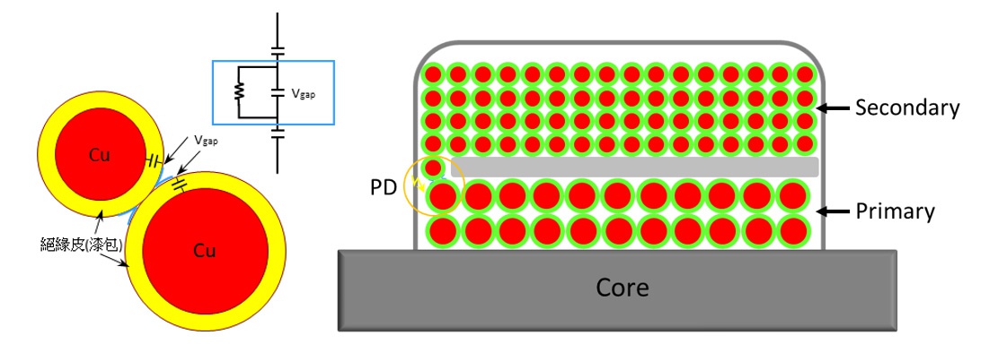 ▲圖四. 變壓器??次側(cè)線圈的線材間發(fā)生局部放電