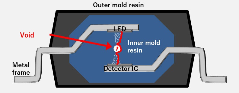 光耦合器與數(shù)字隔離器被應(yīng)用于各種需要隔離的環(huán)境,當隔離的高電壓跨越在含有氣泡或裂縫的絕緣材料時,就可能會有足夠高的分壓在氣泡或裂縫上導(dǎo)致發(fā)生局部放電。 經(jīng)過長時間的劣化后,因絕緣材料的絕緣失效而導(dǎo)致電壓的隔離失效(如圖五)。