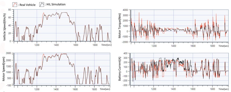 下圖包含車速、電機(jī)轉(zhuǎn)速轉(zhuǎn)矩與電池電流的測(cè)試結(jié)果,顯示Chroma Power HIL設(shè)備仿真的電池充放電和驅(qū)動(dòng)馬達(dá)輸出相關(guān)數(shù)據(jù)與創(chuàng)奕實(shí)車運(yùn)行數(shù)據(jù)高度匹配,進(jìn)而驗(yàn)證此測(cè)試方法的精確性和可行性,整體成果不僅證實(shí)Chroma設(shè)備和Altair模型的可靠性,也為整車開發(fā)提供數(shù)據(jù)支持,有效幫助后續(xù)電池壽命與性能之提升。