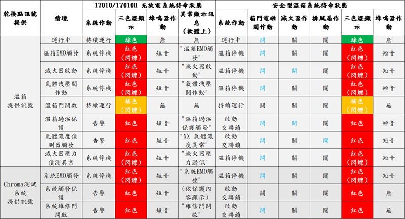 Chroma 17010/17010H 電池芯充放電測試系統(tǒng)多年來在世界各大知名電芯廠、車廠、儲能系統(tǒng)廠中之所以獲得采納與肯定,除了在充放電量測性能上的高精準(zhǔn)度、低輸出噪聲、以及軟件和硬件多重安全保護(hù)以外,可彈性整合安全型環(huán)境箱的控制指令,基于安全管制矩陣(下表二)構(gòu)建一站式測試系統(tǒng),發(fā)生測試危害時(shí),讓溫箱與充放電設(shè)備透過訊號交聯(lián)來即時(shí)限縮危害范圍,協(xié)助客戶安全地完成電池測試任務(wù)。