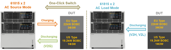 Chroma 61815作為3U/15kVA的高功率密度電網(wǎng)仿真電源,不僅能作為交流源來(lái)模擬市電,亦可透過(guò)交流負(fù)載選配功能,來(lái)仿真家用設(shè)備或其他交流負(fù)載特性。透過(guò)兩臺(tái)61815單機(jī)并聯(lián)搭配專用的接線整合治具,能以10U高的精簡(jiǎn)設(shè)備體積和單純的三相四線輸出設(shè)計(jì),輕松實(shí)現(xiàn)歐洲22kW三相、及美國(guó)19.2kW的單相三線的交流測(cè)試方案。且針對(duì)V2G、V2H、V2L等測(cè)試情境條件,Chroma 61815可一鍵切換交流源和交流載模式,仿真不同電網(wǎng)環(huán)境(如頻率、電壓變化)及不同負(fù)載條件,來(lái)對(duì)應(yīng)BOBC各項(xiàng)交流測(cè)試需求。