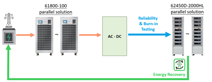 針對(duì)Sidecar HVDC架構(gòu)下AC-DC模塊的系統(tǒng)信賴性測(cè)試(Reliability Test)與崩應(yīng)測(cè)試(Burn-in Test)等長(zhǎng)時(shí)間操作需求,62450D-2000HL內(nèi)建的能源回收式負(fù)載功能可將測(cè)試過程中產(chǎn)生的能量有效回饋至電網(wǎng),于額定操作下回收效率高達(dá)94%,協(xié)助節(jié)能減碳、降低電費(fèi)支出,并減少冷卻系統(tǒng)負(fù)擔(dān)。
