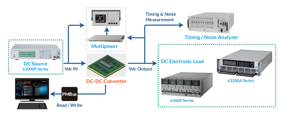 服務(wù)器內(nèi)部的直流(DC-DC)轉(zhuǎn)換器能將輸入電壓范圍40V至60V轉(zhuǎn)換為12V,每個(gè)轉(zhuǎn)換器功率可達(dá)數(shù)千瓦,電流達(dá)上百安培。不僅需輸出穩(wěn)定的電壓,轉(zhuǎn)換效率需達(dá)到98%以上。部分元件如內(nèi)存、CPU處理器、集成電路(ASIC)等使用低于12V的電壓,同樣需要DC-DC轉(zhuǎn)換器進(jìn)行調(diào)整。甚至AI服務(wù)器內(nèi)部的GPU使用的Vcore電源模塊需將電壓降至1V以下,同時(shí)輸出電流需達(dá)到上千安培。Chroma的電源測(cè)試方案包含直流電源與高性能電子負(fù)載,可滿足各種直流需求。轉(zhuǎn)換器的規(guī)格。其高精度的測(cè)量功能滿足測(cè)試效率的要求。此外,還可靈活配置儀器組成Chroma 8000自動(dòng)化測(cè)試系統(tǒng),全面驗(yàn)證直流轉(zhuǎn)換器的規(guī)格與性能,也可應(yīng)用于生產(chǎn)線進(jìn)行高效測(cè)試。
