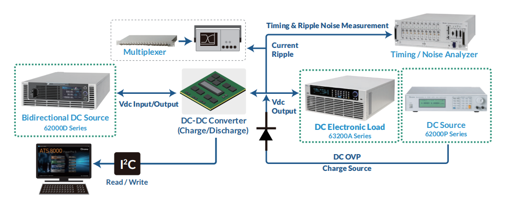 當(dāng)Power shelf斷電時(shí),BBU內(nèi)部的雙向直流電源(DC/DC converter)將電池轉(zhuǎn)換為服務(wù)器所需的電壓。當(dāng)Power shelf復(fù)電后,再對(duì)電池充電。所以此電源要能快速啟動(dòng)輸出,并符合服務(wù)器對(duì)電源的動(dòng)態(tài)負(fù)載要求。也能在對(duì)電池模塊的充電時(shí),精準(zhǔn)操作在定電流充電模式。Chroma的電子負(fù)載63200A系列能符合OCP ORV3測(cè)試指南規(guī)范要求,驗(yàn)證此電源模塊在實(shí)際應(yīng)用中的規(guī)格與可靠度。62000D系列的雙向直流源,可模擬Power shelf的輸出電壓,也可用來(lái)模擬BBU內(nèi)的電池模塊,進(jìn)行雙向的電流測(cè)試。Chroma可依此直流電源的測(cè)試需求,整合適當(dāng)設(shè)備,編程測(cè)試項(xiàng)目與測(cè)試流程,組成自動(dòng)化測(cè)試系統(tǒng)??捎糜诋a(chǎn)品開發(fā)階段的完整驗(yàn)證,或用于生產(chǎn)線的EOL測(cè)試系統(tǒng)。其相關(guān)測(cè)試系統(tǒng)構(gòu)架與設(shè)備建議如下圖。