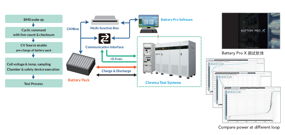 Chroma充放電測試系統(tǒng)170X0系列可通過測試工步設(shè)定模擬電池BMS喚醒,并與BMS通信監(jiān)測電芯狀態(tài)。同時可控制充放電以動態(tài)調(diào)整充電電流(CC模式)同步驗證電池管理系統(tǒng)(BMS)通信狀態(tài),以確保電池組充電功能與效率的最優(yōu)化。并可整合數(shù)據(jù)記錄器與溫控箱等設(shè)備,提升整體測試靈活性。實時監(jiān)控機(jī)制能協(xié)協(xié)助掌握電池測試狀態(tài)與異常,確保操作安全與數(shù)據(jù)準(zhǔn)確性。通過模擬BBU實際負(fù)載和充電行為,輔助驗證電池模組效能并優(yōu)化系統(tǒng)設(shè)計。