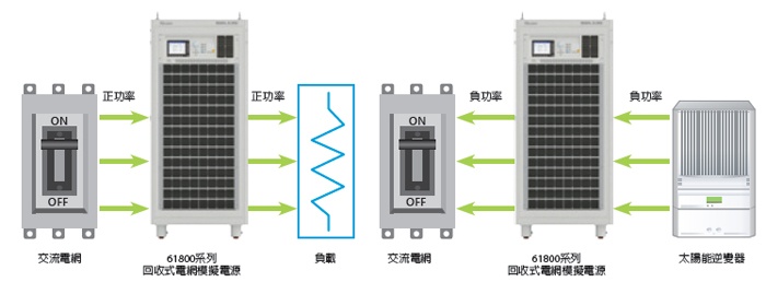 Chroma 61860回收式電網(wǎng)模擬電源是一款定電壓輸出的可編程交流電源,可應(yīng)用于一般用電產(chǎn)品(例如: 家電產(chǎn)品,開關(guān)式電源)的測試,測試時Chroma 61860回收式電網(wǎng)模擬電源會對負(fù)載輸出功率,通過拉載過電流設(shè)定(OCP)功能來保護Chroma 61860。當(dāng)待測物為能將能量回饋到電網(wǎng)的產(chǎn)品(例如:太陽能逆變器,雙向充放電機)等分散式發(fā)電設(shè)備時,Chroma 61860在輸出電壓的同時,若偵測到輸出得功率為”負(fù)(-)”功率時,Chroma 61860就會啟動能源回收機制,將逆變器所產(chǎn)生的逆灌電流/負(fù)功率能量轉(zhuǎn)換到交流電網(wǎng)。通常的交流電源無法承受待測物回灌的能量。Chroma 61860可應(yīng)用到正負(fù)電壓/電流正反方向的四象限,且具備能源回收功能,正足以成為電網(wǎng)模擬電源。
