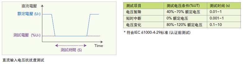 此外Chroma 61500系列產品能夠模擬IEC 61000-4-29* Electromagnetic compatibility (EMC)-Part 4-29: Testing and measurement techniques- Voltage dips, short interruptions and voltage variations on dc input power port immunity tests法規(guī)對于直流電壓暫降、短暫中斷和電壓變化測試條件(%UT) 如下表。