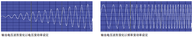 Chroma 61500系列可編程交流電源供應器可以讓使用者設定電壓或頻率的輸出變動率,當輸出的電壓或頻率改變時,就會依照設定的變動率逐漸達到最終值。這可以幫助使用者驗證產品的操作范圍,例如可設定頻率由47Hz逐漸增加到63Hz,或電壓由90V逐漸增加到264V,取代只驗證輸入90V、115V、230V及264V幾個電壓點的方式。另外對待測物開機時,用電壓由0V逐漸上升的方式來減少輸入的浪涌電流,可應用在馬達的啟動,或多個產品同時開機測試。