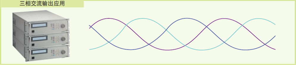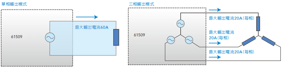 Model 61501/61502/61503/61504/61505機種則可以使用三臺單機,在三相模式的同步機制下串聯(lián)成三相電輸出使用。