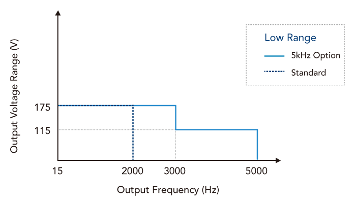 Chroma 61509/61508/61507機種可藉由選購配件提供5kHz高頻率輸出功能。而搭載此選購配件后,交流源機臺會有不同的High / Low檔位輸出電壓范圍,其細節(jié)如下圖所示。