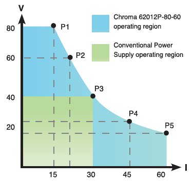 62000P系列直流電源供應(yīng)器提供寬廣的操作范圍。例如,62012P-80-60的輸出規(guī)格為1200W/80V/60A可于不同的組合中靈活操作如圖右側(cè)所示。如普通的直流電源電源供應(yīng)器顯示提供所有的輸出電壓相同的額定電流,而62000P于低輸出電壓時提供較大的電流。這表示低電壓/高電流及高電壓/低電流兩者的待測物可使用單臺直流電源供應(yīng)器測試輸入穩(wěn)定度,于一般的ATE系統(tǒng)內(nèi)部避免多臺直流電源供應(yīng)器以節(jié)省成本與空間。