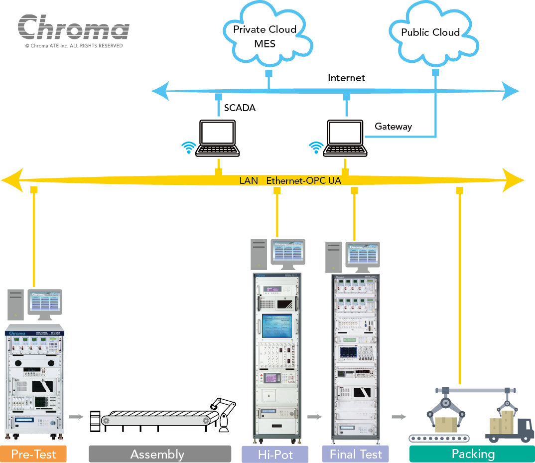 Chroma 8000自動測試系統(tǒng)適合現(xiàn)代化的大規(guī)模量產(chǎn)生產(chǎn)線,可搭配支援Chroma Sajet制造資訊系統(tǒng)(Manufacturing Execution System, MES)進行測試站別、人員、產(chǎn)品序號及測試程式的控制與管理,以及測試數(shù)據(jù)上傳中央伺服器功能,達到測試程式集中管理與數(shù)據(jù)資料搜集/報表分析等應用,協(xié)助客戶完成智能工廠之目標,提高產(chǎn)品品質(zhì)、效能,降低生產(chǎn)成本,創(chuàng)造企業(yè)利益最大化。另Chroma可提供客制化Shop-Floor控制系統(tǒng)服務,連結(jié)客戶廠內(nèi)既有MES,到目前為止已協(xié)助眾多海內(nèi)外世界級制造大廠完成MES系統(tǒng)整合之實績案例。