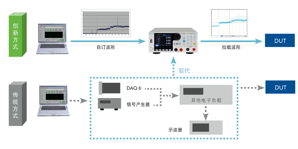 傳統(tǒng)拉載任意電流波形的方式需要通過DAQ卡或任意波形產(chǎn)生器將電流波形送給電子負(fù)載進(jìn)行拉載;創(chuàng)新的用戶自訂波形方式是將電流波形存儲(chǔ)內(nèi)部建的快閃記憶體(Flash),可儲(chǔ)存10組電流波形,最高可達(dá)150萬個(gè)波形點(diǎn)數(shù),拉載實(shí)際電流的同時(shí),亦提供拉載過程中所發(fā)生的最大電壓電壓的正負(fù)值,大大節(jié)省了使用示波器確認(rèn)電壓峰值的 時(shí)間。