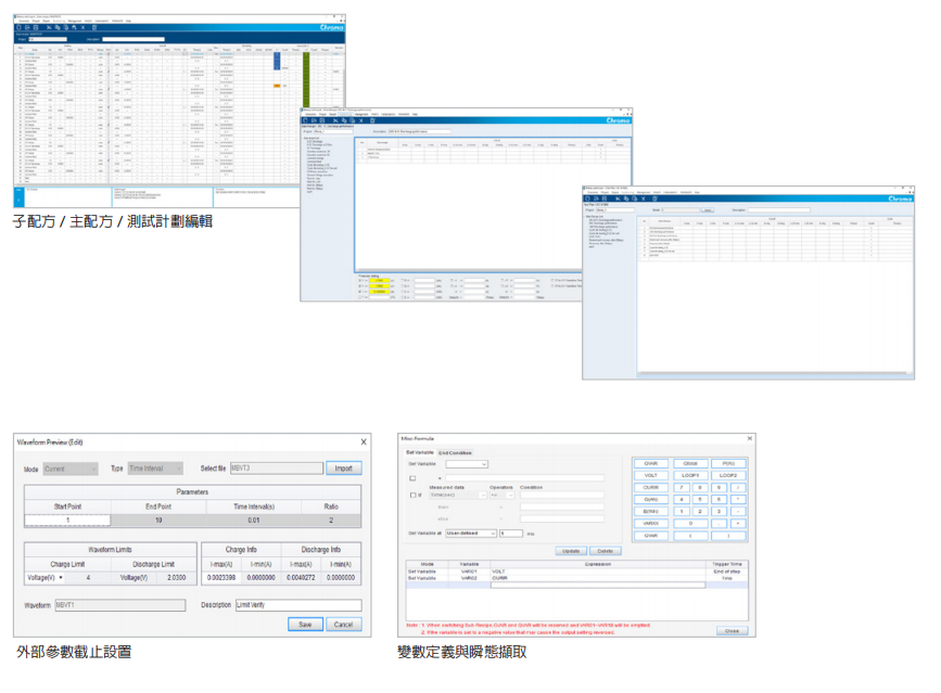 階層式編輯構(gòu)架(測(cè)試計(jì)劃→主配→子配方),可將現(xiàn)有配方透過(guò)替換測(cè)試物規(guī)格直接共享測(cè)試、或是透過(guò)彈性組合既有子配方來(lái)快速建立完整計(jì)劃,以及創(chuàng)建新配方來(lái)滿足各類(lèi)型充放電測(cè)試應(yīng)用。