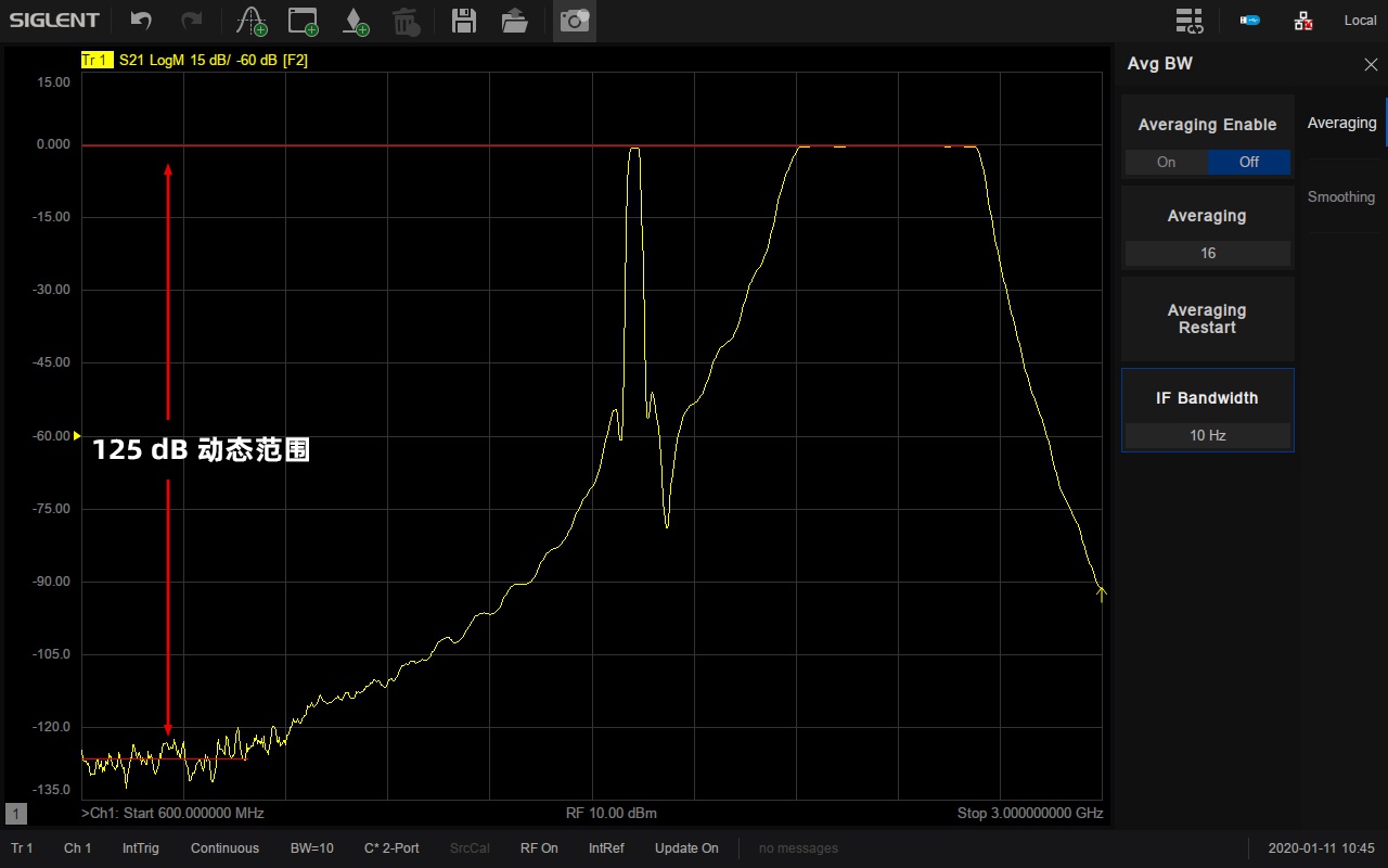 系統(tǒng)動態(tài)范圍是VNA一個非常重要的指標(biāo),它是VNA源的最大輸出功率與測試端口本底噪聲的差值。SNA5000X的動態(tài)范圍可達(dá)125 dB@10Hz IFBW,接收機(jī)噪底-125 dBm/Hz,可適用于對動態(tài)范圍要求比較高的測試場景,比如同時測量濾波器的通帶和帶外抑制性能。