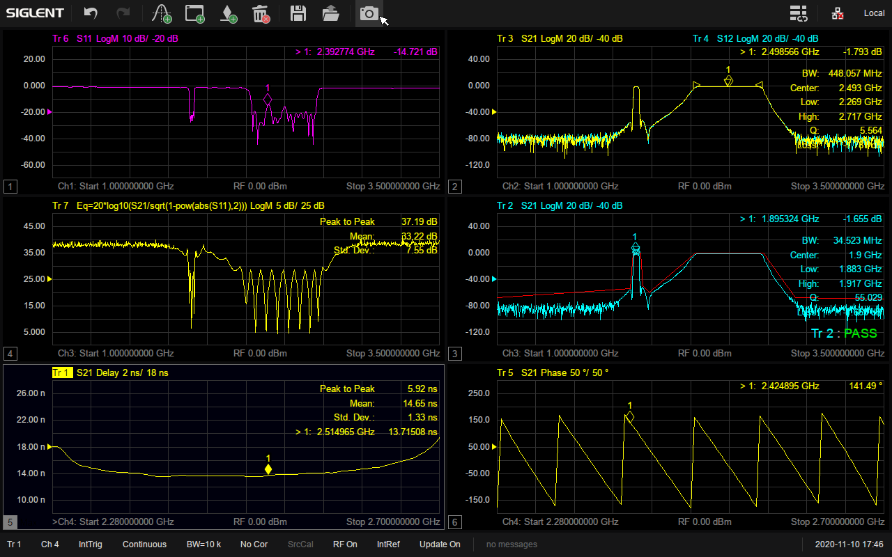 SNA5000X系列支持在多個窗口添加多條跡線進(jìn)行全4端口S參數(shù)測試,并且具備多種顯示格式,比如 Log Mag,Lin Mag,Phase,Delay,Smith,SWR,Polar等,可以方便快捷地分析被測物的傳輸系數(shù),反射系數(shù),駐波比,阻抗匹配,相位,延時等參數(shù)。在生產(chǎn)線驗證天線,濾波器等的特性時,還可以保存參考跡線或者添加Limit模板進(jìn)行通過失敗測試,有利于提高生產(chǎn)效率。