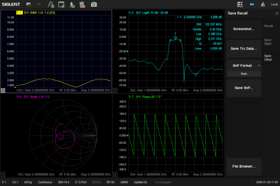 除開外觀設(shè)計(jì),其先進(jìn)的用戶界面,配合上12.1英寸超大觸摸屏與外接的鼠標(biāo)和鍵盤,讓工程師能更快的添加或刪除窗口,通道和跡線。SNA5000A支持在多個(gè)窗口下,添加多條跡線進(jìn)行S參數(shù)測(cè)量。并且測(cè)量結(jié)果,可以多種數(shù)據(jù)格式顯示,如 Log Mag,Lin Mag,Phase,Delay,Smith,SWR,Polar等,可以方便快捷地分析被測(cè)物的傳輸系數(shù),反射系數(shù),駐波比,阻抗匹配,相位,延時(shí)等參數(shù)。