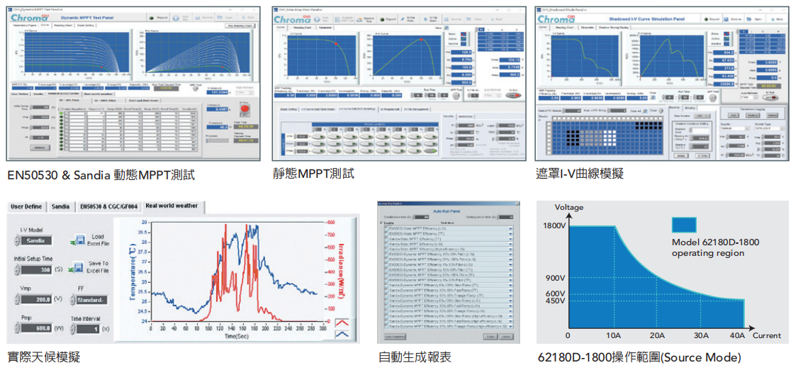 62180D-1800機(jī)型具選配太陽電池?cái)?shù)組模擬功能,于單機(jī)內(nèi)置EN50530 & Sandia的SAS模型方便使用者透過前面板操作或遠(yuǎn)端控制整合使用,軟體具有靜態(tài)及動(dòng)態(tài)最大功率點(diǎn)追蹤(MPPT)測(cè)試、掩碼I-V曲線模擬、實(shí)際天候的I-V曲線變化測(cè)試、自動(dòng)程序靜態(tài)&動(dòng)態(tài)MPPT性能測(cè)試及自動(dòng)生成報(bào)表于Excel表格內(nèi),以上非常適合驗(yàn)證組串式光伏逆變器性能。另外,62180D-1800(1800V/40A/18kW)機(jī)種可支持主/從并聯(lián)30臺(tái),輸出規(guī)格達(dá)540kW/ 1800V/ 1200A以調(diào)節(jié)于高壓1500V商業(yè)(15-100kW)組串式逆變器及分布式發(fā)電站用(150-500kW)逆變器測(cè)試使用。