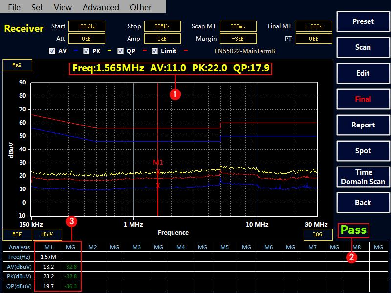 選擇“Final” 按鍵,接收機(jī)會(huì)對表格中的點(diǎn)進(jìn)行終測,測量 PK,AV,QP 值,測量時(shí)間在Final MT 中設(shè)置。如果沒有超標(biāo)點(diǎn)或者手動(dòng)添加的測試點(diǎn),F(xiàn)inal 終測是無效的。注意:終測時(shí)請不要關(guān)閉被測設(shè)備。