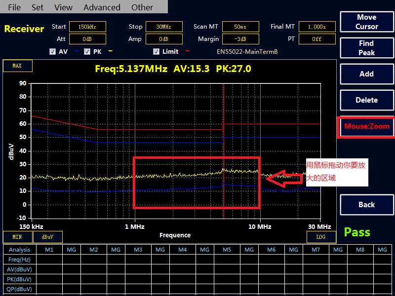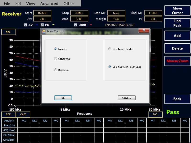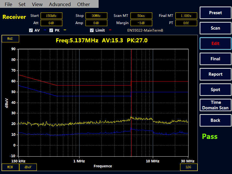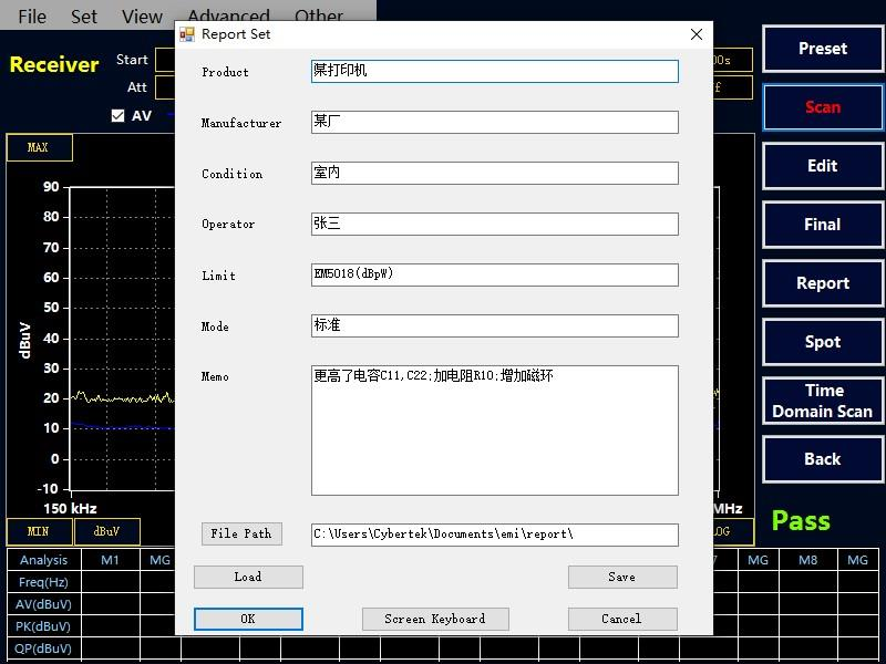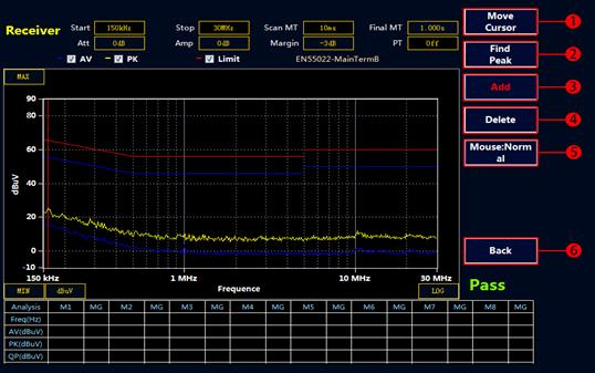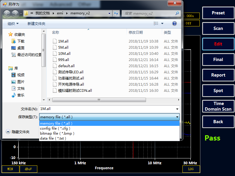 all(保存當(dāng)前掃描數(shù)據(jù)與配置)方便用戶下次直接調(diào)用之前保存的配置(包括頻率,限制線,補(bǔ)償,測試曲線等數(shù)據(jù))和兩種曲線的對比。