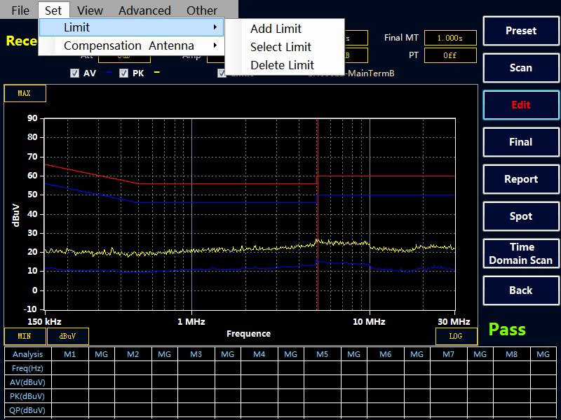 選擇測試標(biāo)準(zhǔn)。按下“MENU”按鍵,顯示菜單欄,使用鼠標(biāo)選擇“Set”----“Limit”----“Select Limit”,選擇所需標(biāo)準(zhǔn)并確定。如需添加新標(biāo)準(zhǔn)可參考”如何繪制標(biāo)準(zhǔn)曲線”。