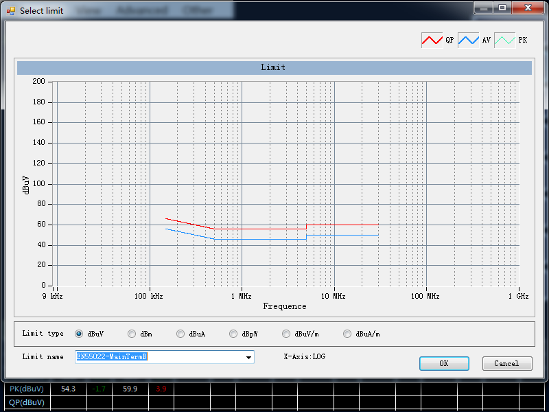 Limit Name 填入標(biāo)準(zhǔn)名稱“EN55022”,單位選擇 dBuV,X 軸選擇 log。