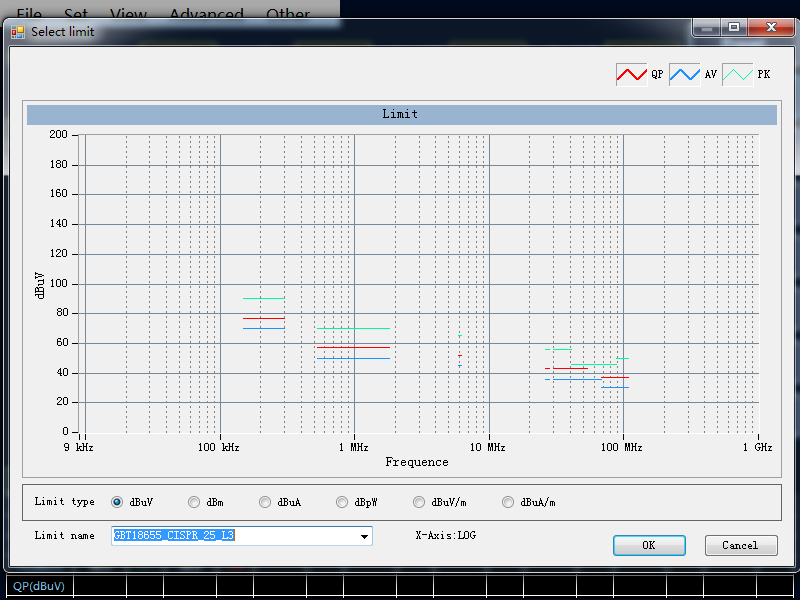 注意:同一個(gè)標(biāo)準(zhǔn)情況下,AV,QP 曲線的 Limit Name 命名一致,這樣調(diào)用時(shí)直接調(diào)出兩條限值線。