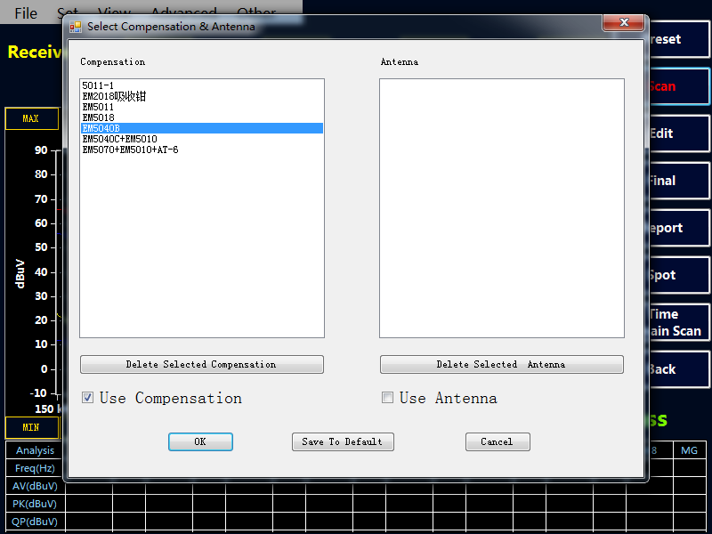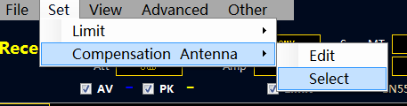 調(diào)用補(bǔ)償曲線時(shí)點(diǎn)擊“Set-Compensation Antenna-Select”,選擇所需的補(bǔ)償曲線。然后點(diǎn)選“Use Compensation”程序?qū)?yīng)用當(dāng)前補(bǔ)償曲線,并在表格上顯示補(bǔ)償?shù)闹怠|c(diǎn)擊 OK 確認(rèn)。