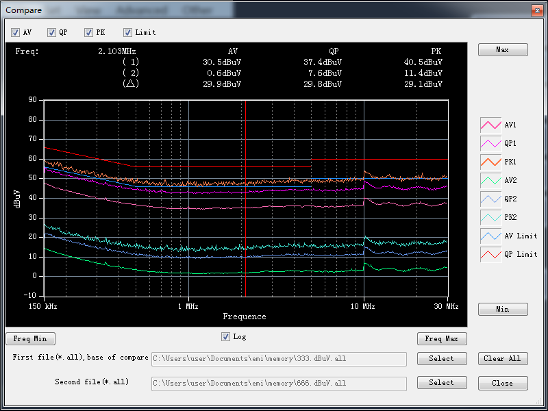 點(diǎn)擊菜單 View----Compare 后,顯示圖片對比界面,調(diào)用兩個(gè).all 文件實(shí)現(xiàn)圖片對比。實(shí)現(xiàn)兩個(gè)圖片中 AV,QP,PK 曲線對比,拖動(dòng)紅線可以對比兩個(gè)圖上 AV,QP,PK 的差值.注:第一張圖片默認(rèn)當(dāng)前掃描的曲線,且所有相關(guān)設(shè)置按照第一張圖片文件為基準(zhǔn)。