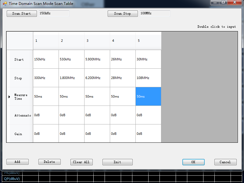 點(diǎn)擊菜單 Advanced----Time Domain Scan Mode Scan Table(時(shí)域掃描) 或者 Stepped Frequency Scan Mode Scan Table(步進(jìn)式掃描)后,彈出掃描頻段設(shè)置對話框。用戶可以根據(jù)自身的需要選擇時(shí)域掃描與步進(jìn)式掃描來設(shè)置掃描頻段,例如汽車電子中用時(shí)域掃描電壓法測試傳導(dǎo)騷擾的頻段分為 6 段。用戶可根據(jù)標(biāo)準(zhǔn)設(shè)置好掃描頻段與掃描時(shí)間,如下圖